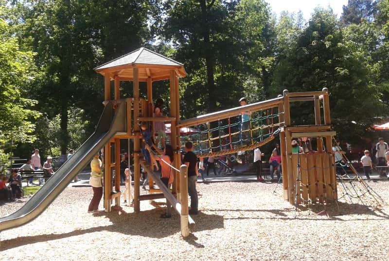 Duży obszar Ogrodu Zoologicznego, zagospodarowany dla zwierząt domowych, oferuje najmłodszym sposobność bliskiego kontaktu ze zwierzętami w specjalnie przygotowanej do tego zagrodzie. Z chwilą, kiedy dzieci wspinają się, huśtają i szaleją do woli na naszych placach zabaw, ich rodzice oraz dziadkowie mają możliwość zasmakowania przysmaków kulinarnych restauracji i punktów gastronomicznych Ogrodu Zoologicznego oraz rozkoszowania się chwilą odpoczynku na tarasie. Plac zabaw jest duży, przestronny, pełen pajęczyn i lin do wspinaczki. Urządzenia są jednak dosyć duże i wysokie (dla mojego 2latka trochę za duże, czego on w ogóle nie przyjmował do wiadomości, więc przeżyłam chwile grozy :-).