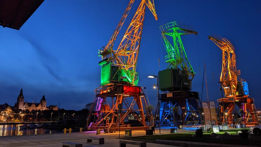 Szczecińskie Dźwigozaury, czyli trzy zabytkowe portowe dźwigi na terenie wyspy Łasztownii na stałe wpisały się w krajobraz miasta, stając się jedną z jego wizytówek. Łosztownia była dawniej zamkniętą wyspą portową - dziś jest miejscem atrakcji i rekreacji. Dźwigozaury nocą są podświetlone i to właśnie wtedy wyglądają najefektowniej.