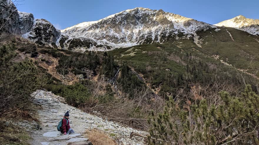 To pieszy szlak o niewielkich nachyleniach terenu, jednak bardzo urozmaicony - trasę pokonujemy przeskakując po kamieniach - wcale nie takich małych! Szlak prowadzi nas przez mostek oraz spływający z gór wodospad, co przy wezbranej wodzie może skończyć się zmoczonym butem. Taka trasa to dla małych wędrowników świetna, górska przygoda, a góry, jezioro i schronisko zupełnie inaczej wyglądają “od drugiej strony”.