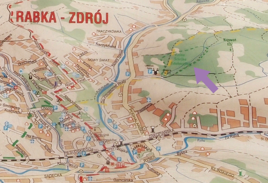 Trasa rozpoczyna się przy ul. Podhalańskiej (możliwość zaparkowania samochodu). Można też rozpocząć spacer w Parku Zdrojowym (szlak żółty, dojście do Uroczyska ok. 30 min). Mapa