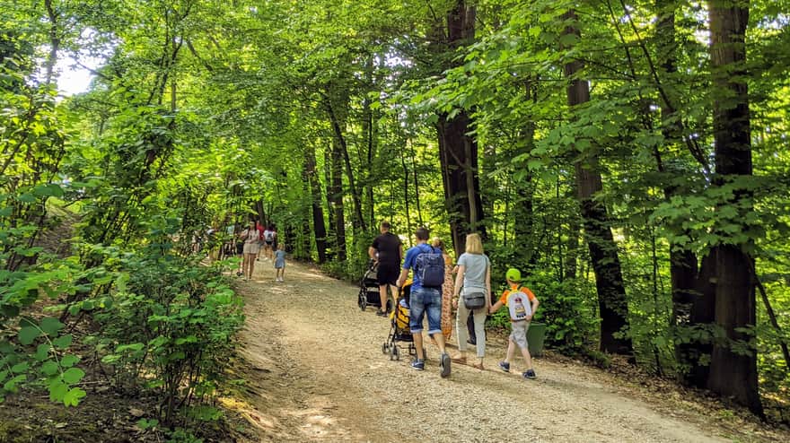 Trakt pieszy z parkingu pod Zoo to szeroka, spacerowa, jednak nieco kamienista ścieżka, która niemal cały czas prowadzi pod górkę. Podejście z wózkiem nie jest więc wcale takie łatwe! Łącznie pokonujemy różnicę nieco ponad 90 m wysokości - taki spacer zajmie nam około 20 minut.