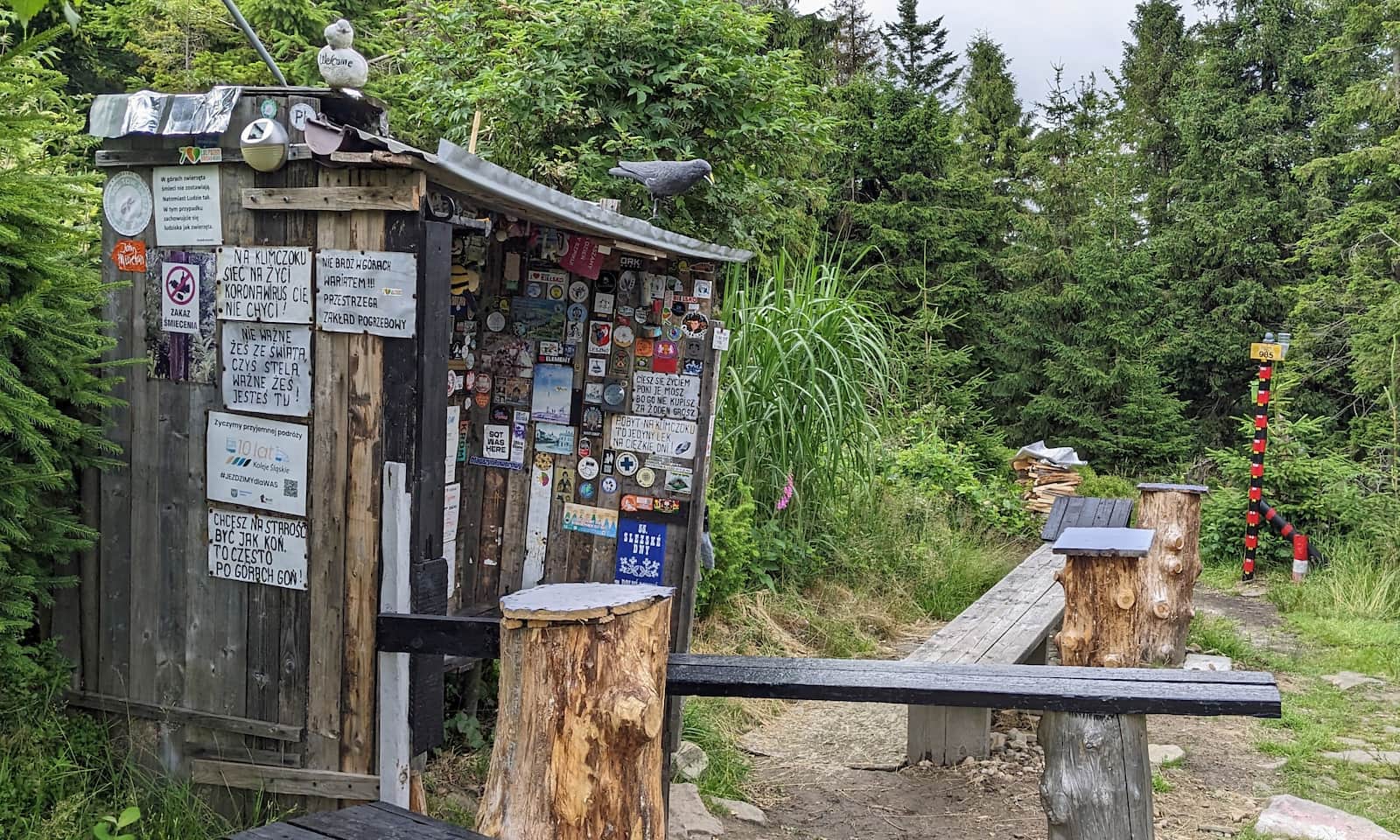 W tym wyjątkowym "ogrodzie" jest też niewielka wiata - możecie tu odpocząć, a także przybić pieczątkę z napisem "Klimczok".