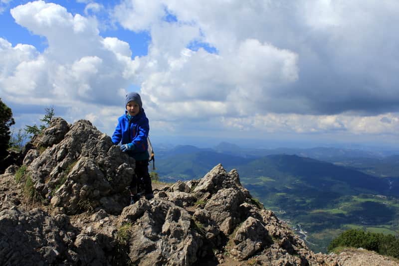 Rano obudziło nas wyczekiwane słońce. Dlatego już o 8:30 byliśmy w Białym Potoku skąd wyruszyliśmy zielonym szlakiem prowadzącym na Mały Rozsutec. Według mapy czekało nas co najmniej pięć godzin marszu plus odpoczynki. Podejście i zejście z samego szczytu Miłosz pokonał w nosidle. Sił miał jeszcze sporo, ale nie dałby rady wspinać się po łańcuchach i klamrach. Poza tym byłoby to bardzo niebezpieczne. Czasami trzeba było wchodzić po niemal pionowej ścianie.