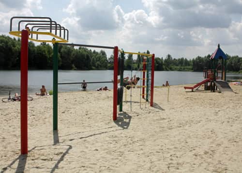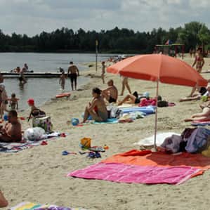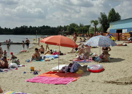 Piaszczysta plaża, strzeżone kąpielisko, pomost, niewielka wypożyczalnia sprzętu wodnego. Głównie w słońcu, ale można znaleźć trochę cienia. Na plaży prawdziwe palmy i mini plac zabaw – zjeżdżalnie, drabinki, huśtawki. Przy plaży niewielki punkt gastronomiczny (słodycze, napoje, Fast-food) i wc. Parking bezpłatny. Możliwy dojazd MPK (przystanek Kwiatkowskiego kiosk). Wygodne dojście ścieżką pieszo-rowerową brzegiem Zalewu od strony zapory. W pobliżu duży, ciekawy plac zabaw nad Jeziorem.