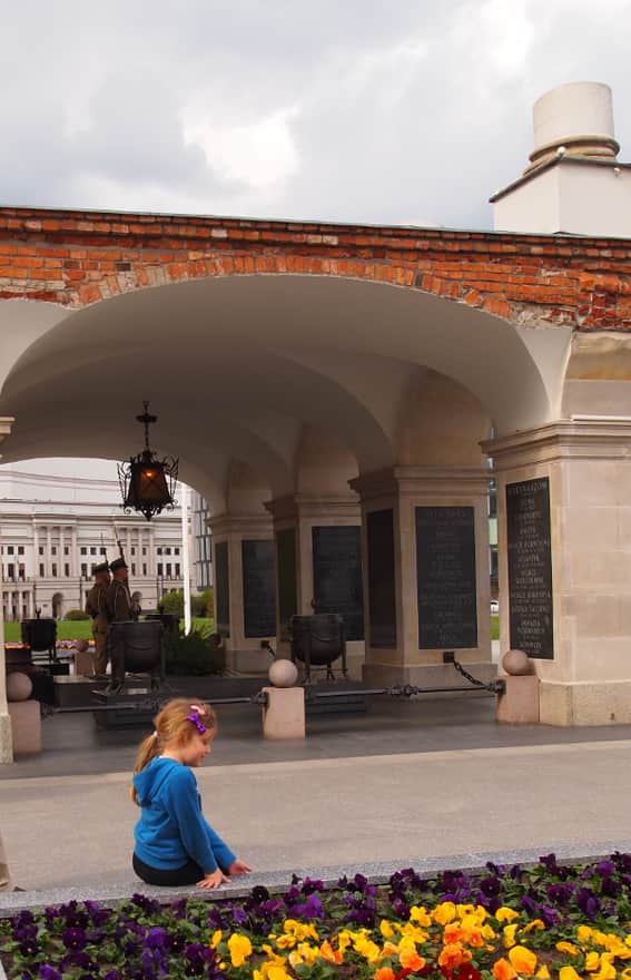 Warto zwrócić dzieciom uwagę, ze pomnik wygląda, jakby był oderwanym fragmentem budynku - arkady dziwnie się urywają, na górze sterczą kikuty zburzonych kolumn... Pomnik jest bowiem częścią dawnego Pałacu Saskiego, który Niemcy wysadzili w powietrze w 1944 r.